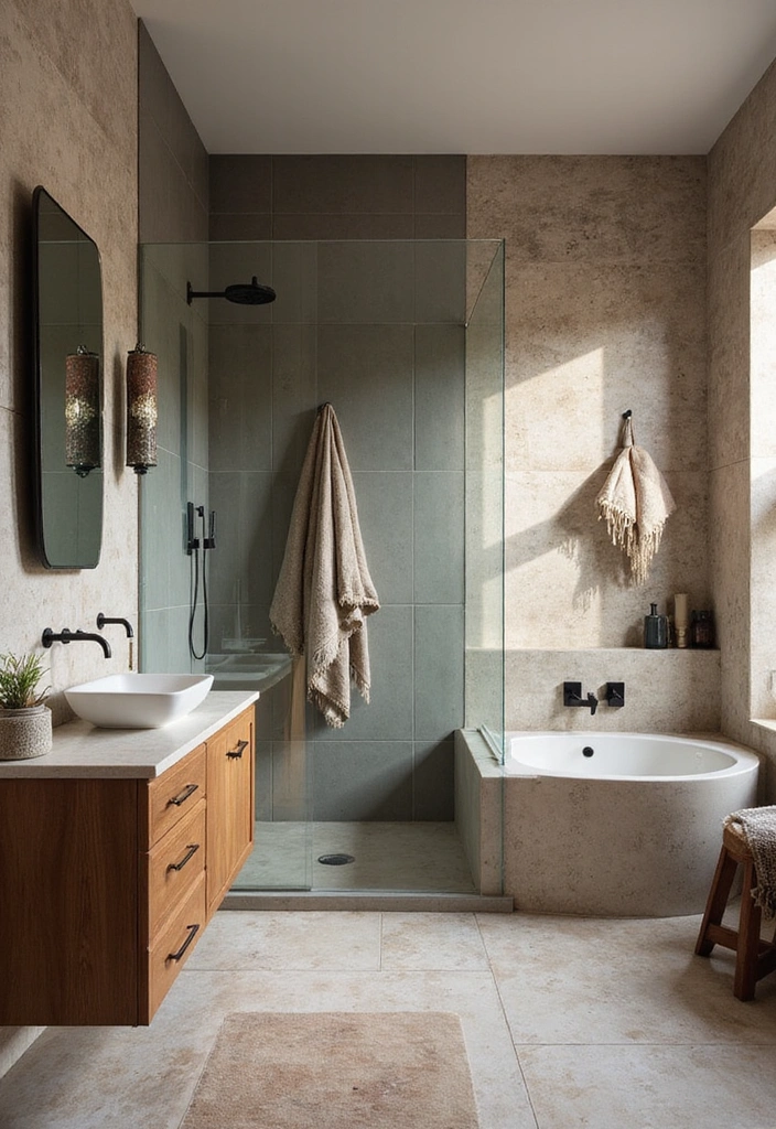Combining different materials in your bathroom can create a dynamic and stylish design.