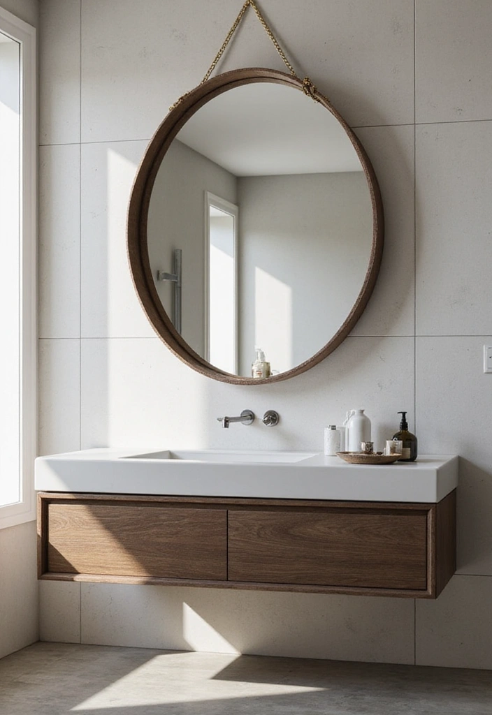 Imagine a bathroom with a floating vanity, a simple white sink, and a sleek mirror without embellishments.