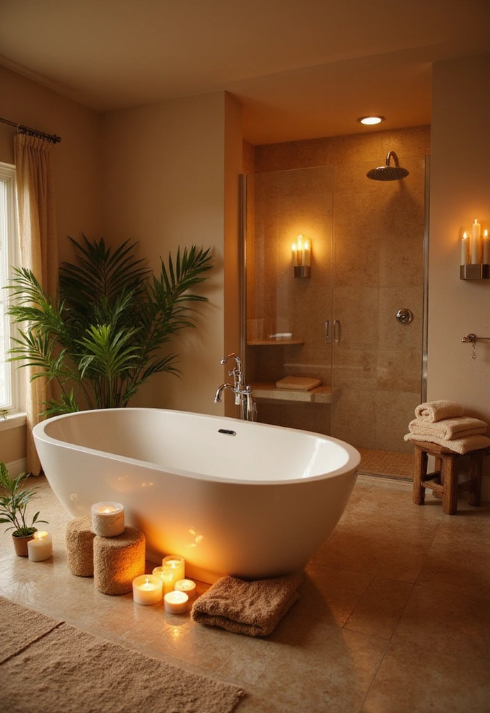 Consider installing a rainfall showerhead for that real spa experience, and don’t forget to add aromatic candles or essential oils for a soothing atmosphere.