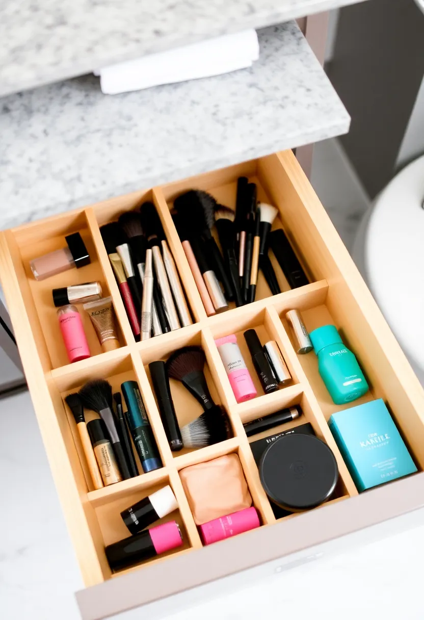 Keep your bathroom drawers organized with dividers that help separate different categories of items.