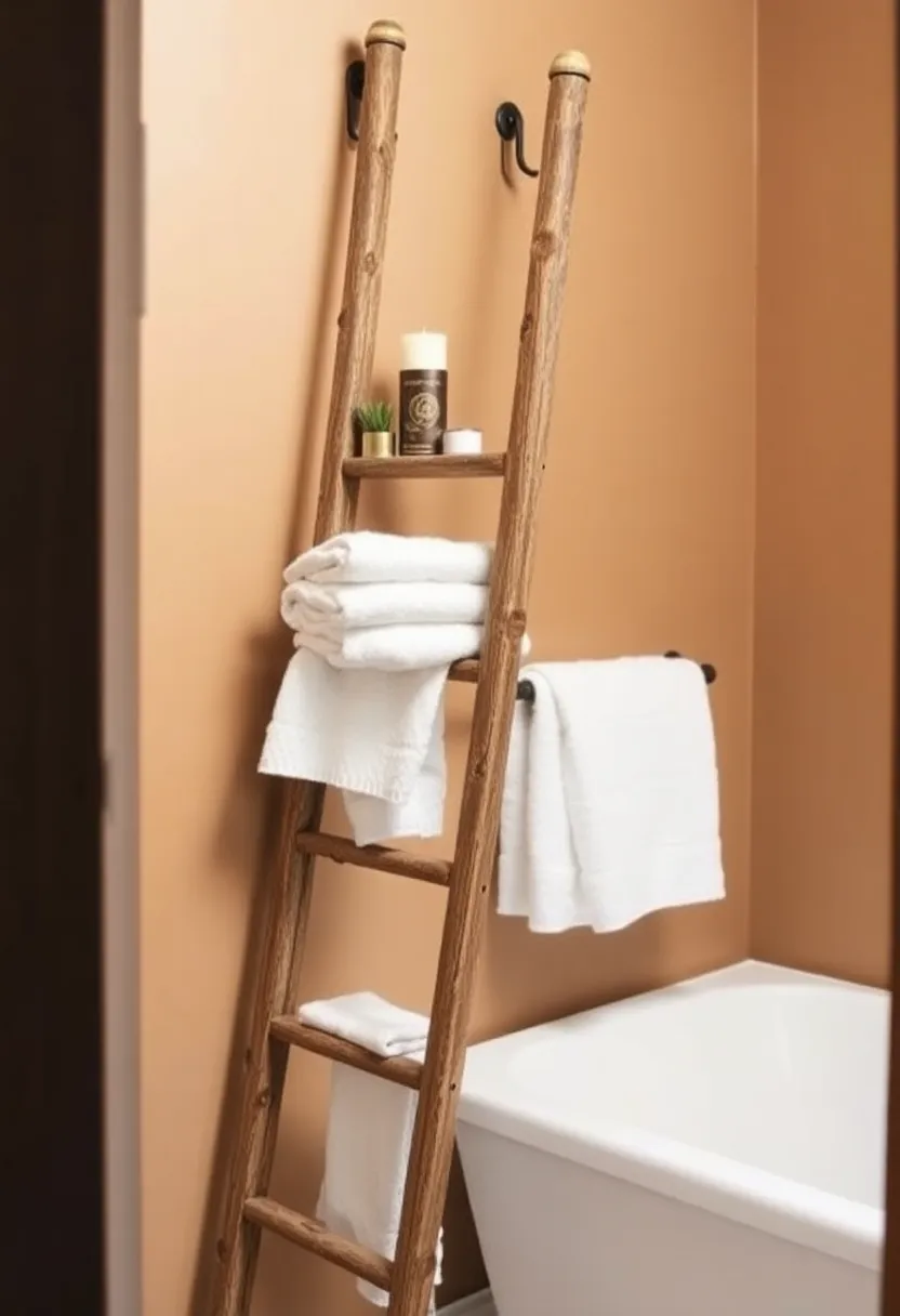 Incorporating a decorative ladder into your bathroom can create an eye-catching storage solution for towels and other essentials.