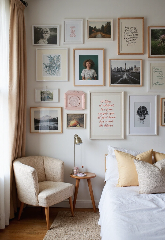 Consider creating a personalized gallery wall with picture frames sourced from thrift stores or craft shops. Fill these frames with everything from inspiring printed quotes to your own unique paintings or cherished photos.