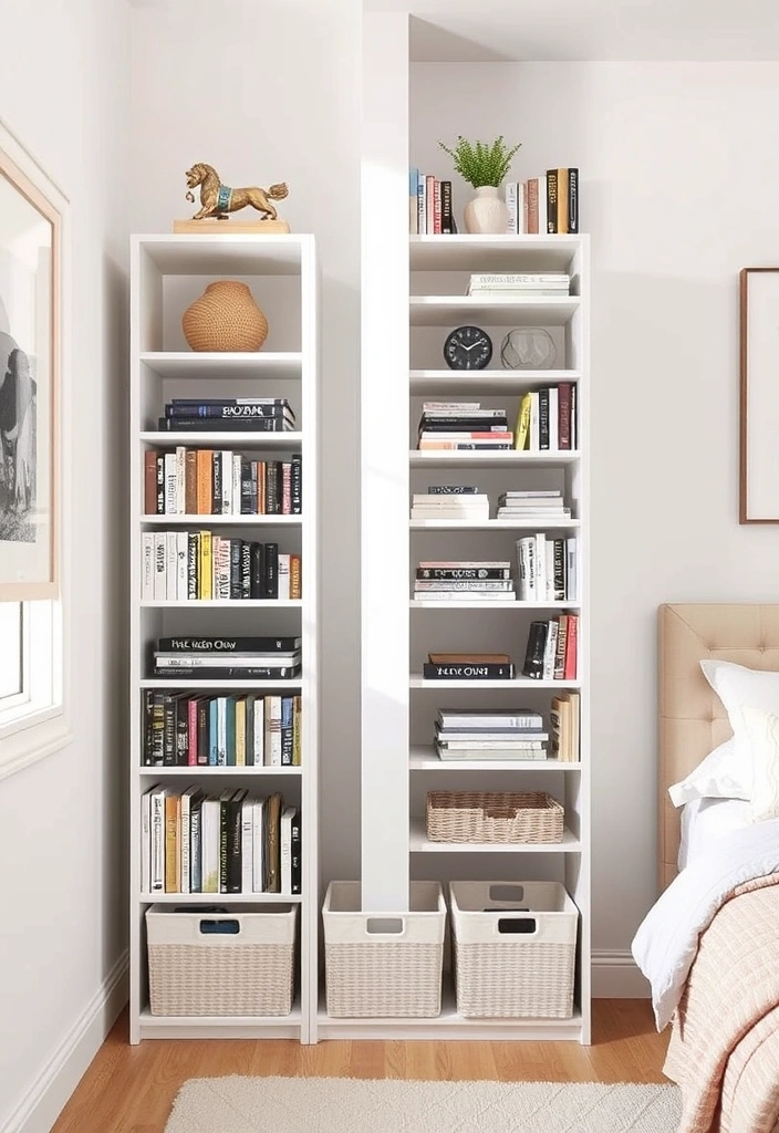 Utilizing tall bookshelves or ladder shelves allows you to take advantage of your room’s height, providing ample storage without crowding the floor. Stack books, display decor, or use baskets to keep everything organized.