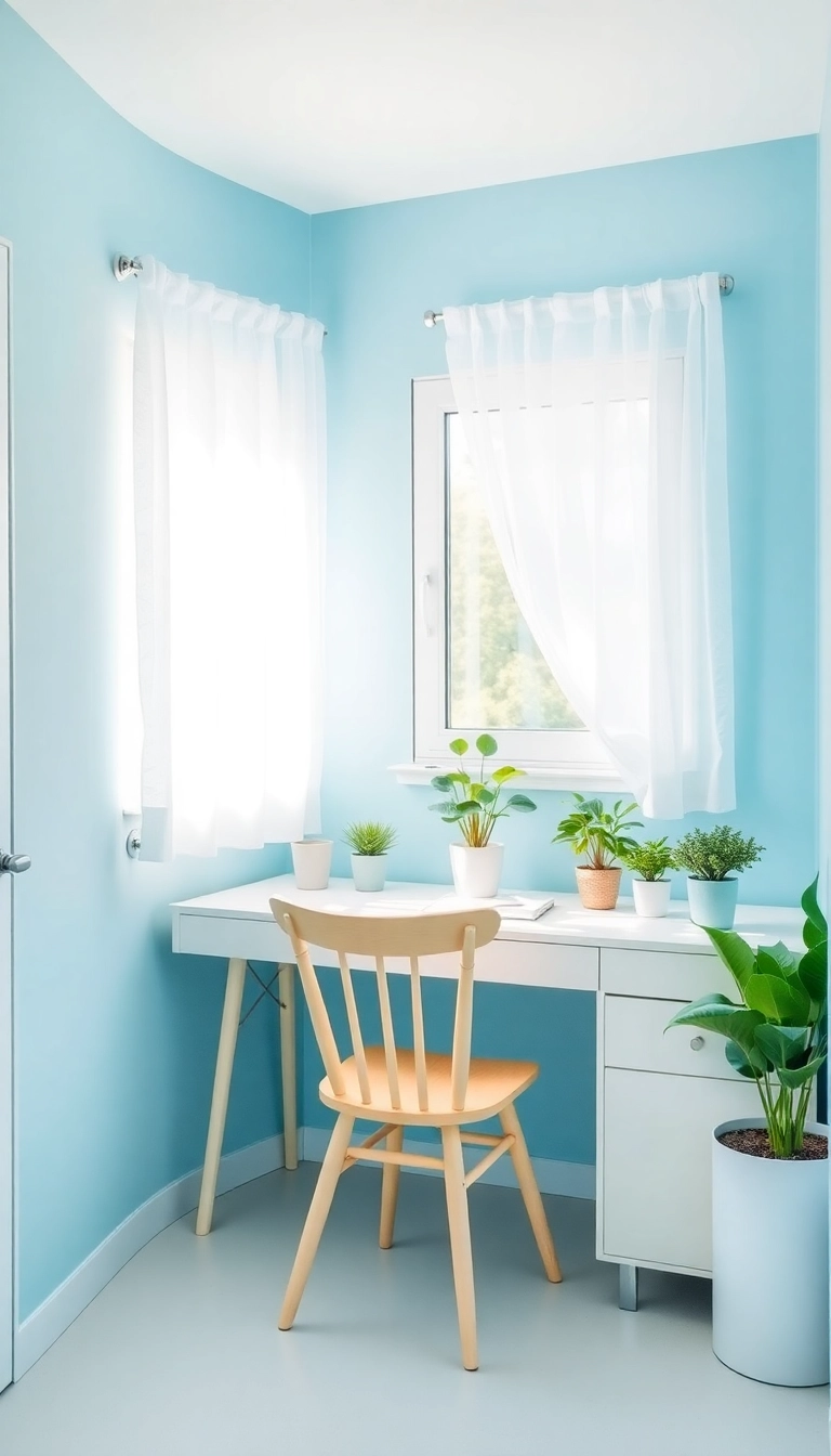 Imagine stepping into a tiny office adorned in soft sky blue with creamy white accents. This color scheme creates a serene and airy ambiance, making the space feel open and inviting.
