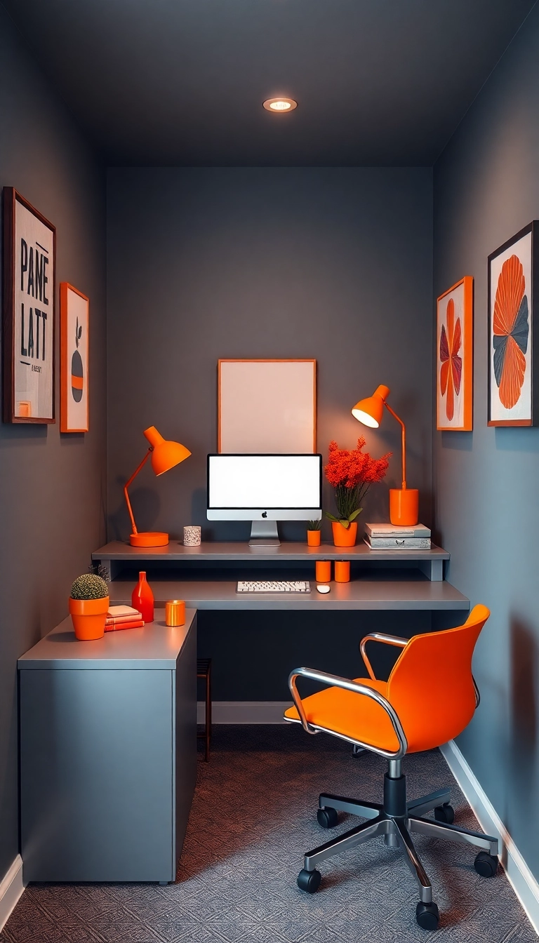 Bright orange paired with cool gray creates a vibrant yet balanced atmosphere in your tiny office. The orange adds energy and warmth, while the gray tempers it with a modern touch.