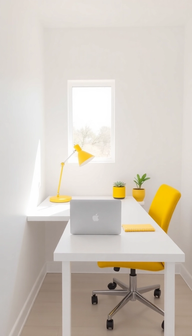 Bright white walls paired with lemon yellow accents can instantly energize your tiny home office. This cheerful scheme reflects light beautifully, making the space feel larger and more vibrant.
