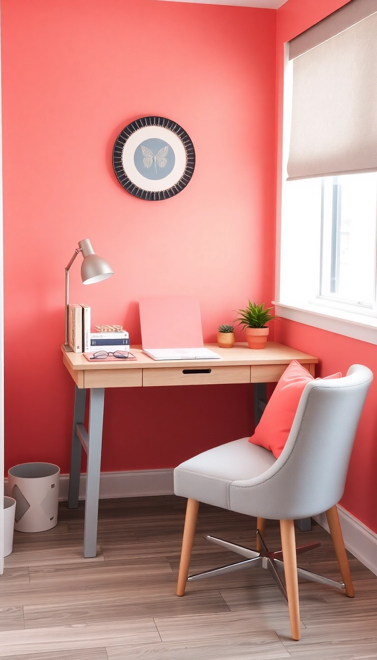 Coral is a vibrant color that brings warmth and energy, making it a perfect choice for tiny office colors. When combined with soft gray, it creates a balanced and inviting workspace.