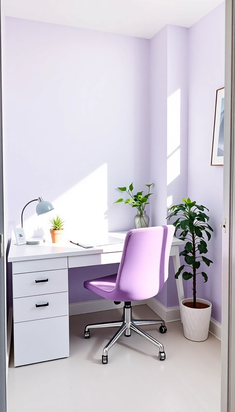 Light lavender paired with crisp white offers a soothing and spacious feel to your home office. This combination is perfect for creating a tranquil environment that encourages focus and creativity.