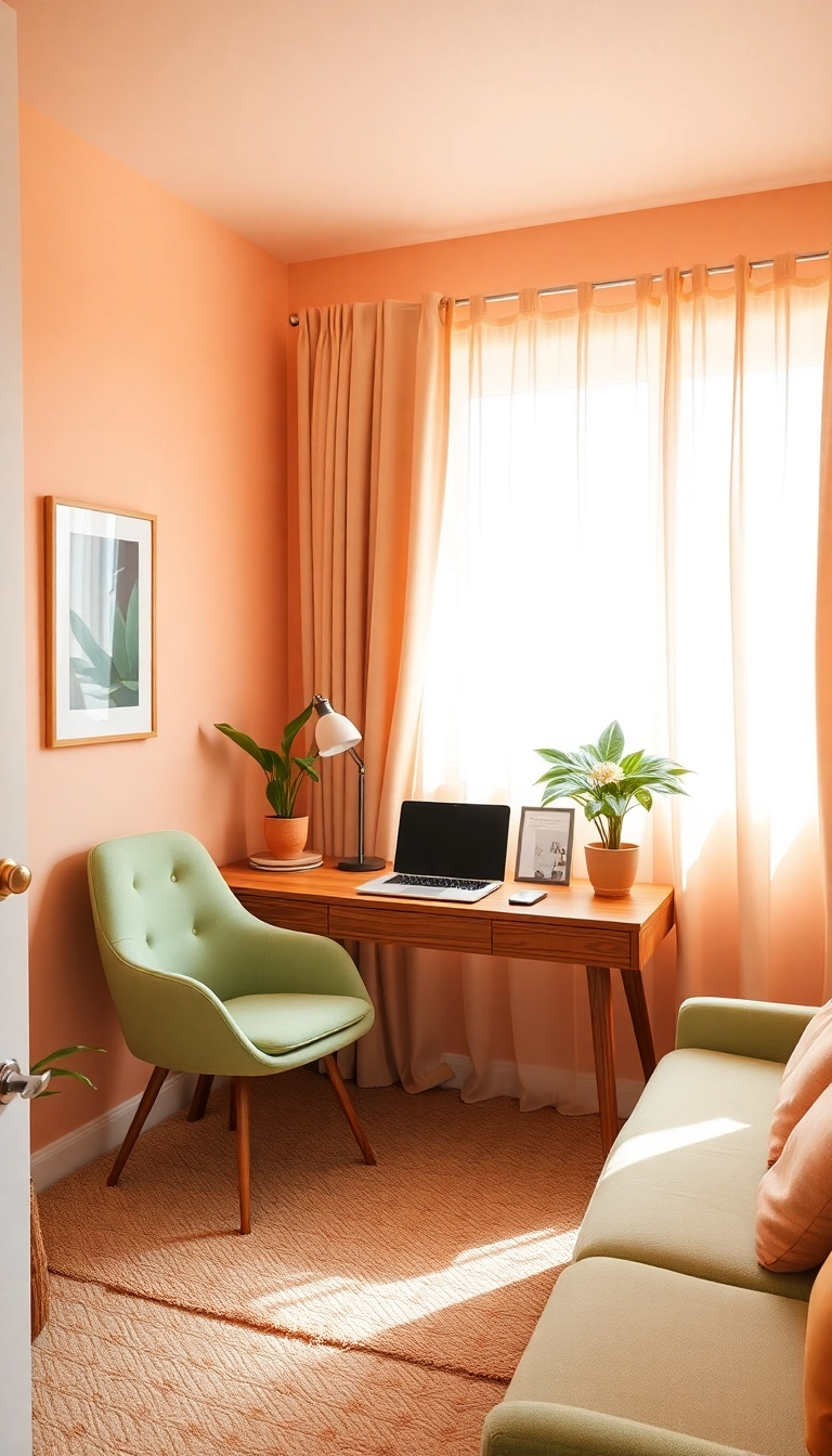 Soft peach and sage green create a delightful and refreshing environment in a tiny office. The peach adds a touch of warmth while the sage green brings in a calming effect.