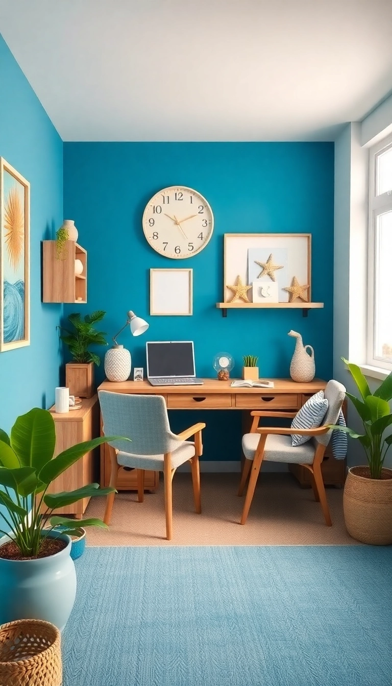 Use ocean blue for wall accents or decor, with sandy beige for furniture and flooring. Adding natural textures like rattan or driftwood can enhance the coastal theme, making your workspace feel like a serene beach retreat.