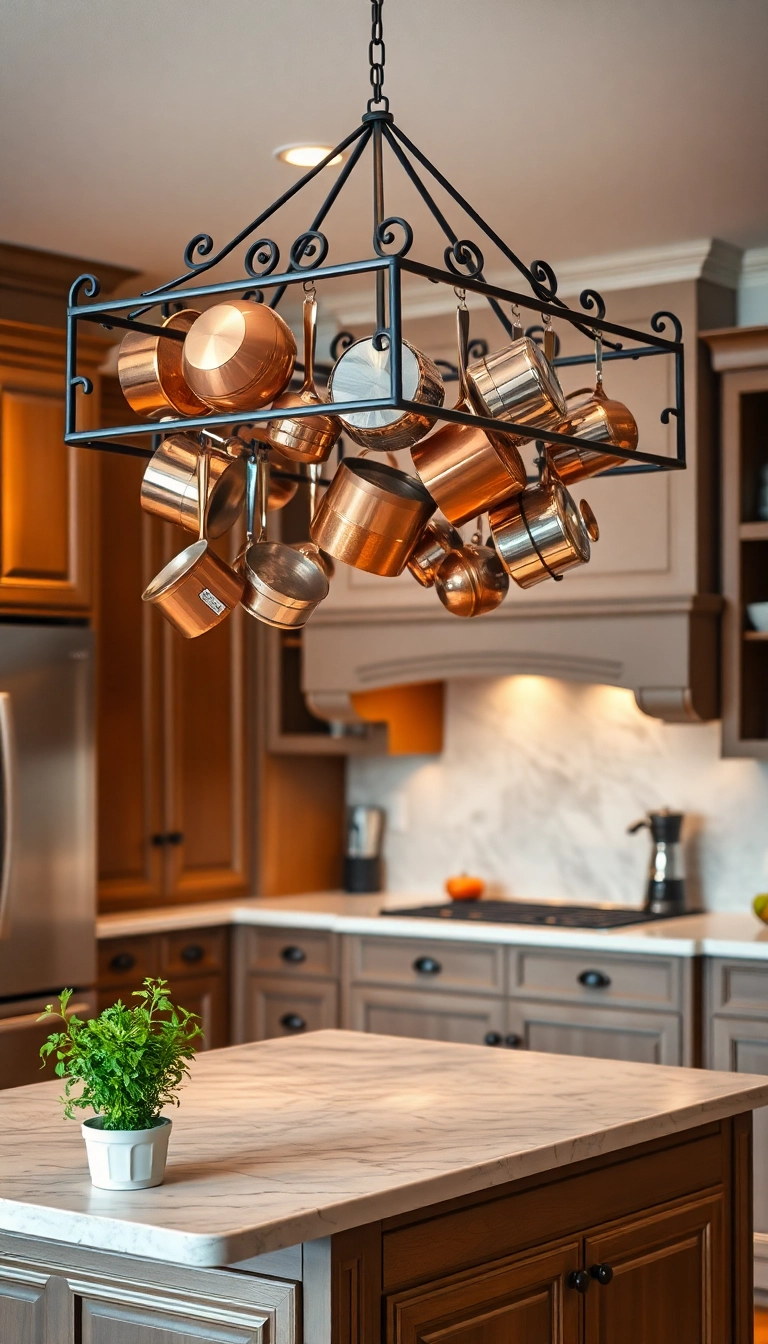 This practical solution not only saves space but also turns your cookware into a beautiful kitchen feature.
