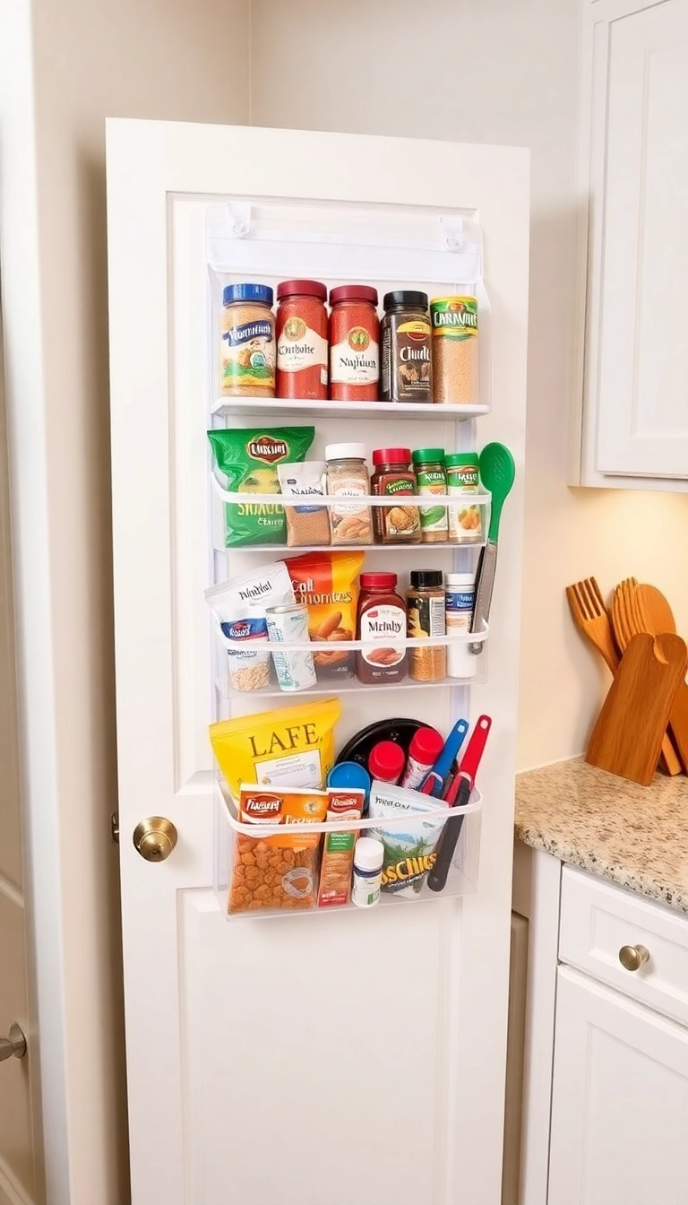 Look for clear pockets or shelves that can fit over cabinet doors or pantry doors.