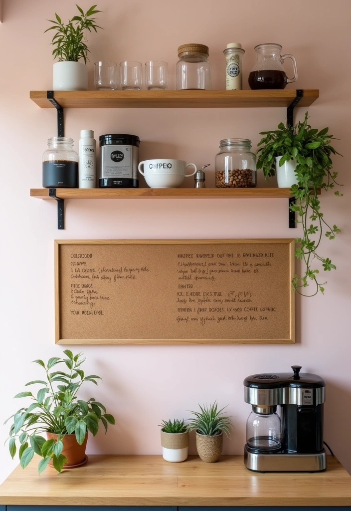 To add a personal touch, hang a corkboard where you can display your favorite coffee recipes and inspiring coffee quotes.