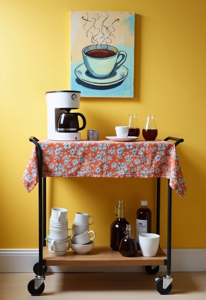 A slim rolling cart can serve as an ideal solution for creating a mini coffee bar in compact spaces.