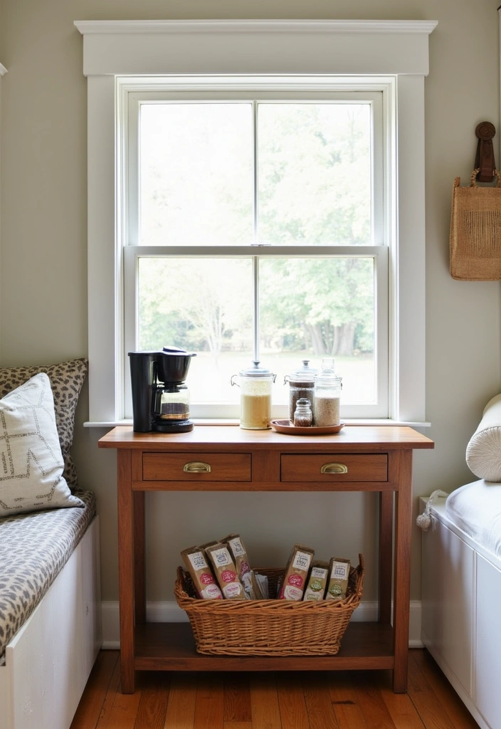 Utilize a narrow console table or a repurposed side table to craft a dedicated area for your brewing essentials. Add a small coffee maker that fits perfectly while still delivering your favorite brews.