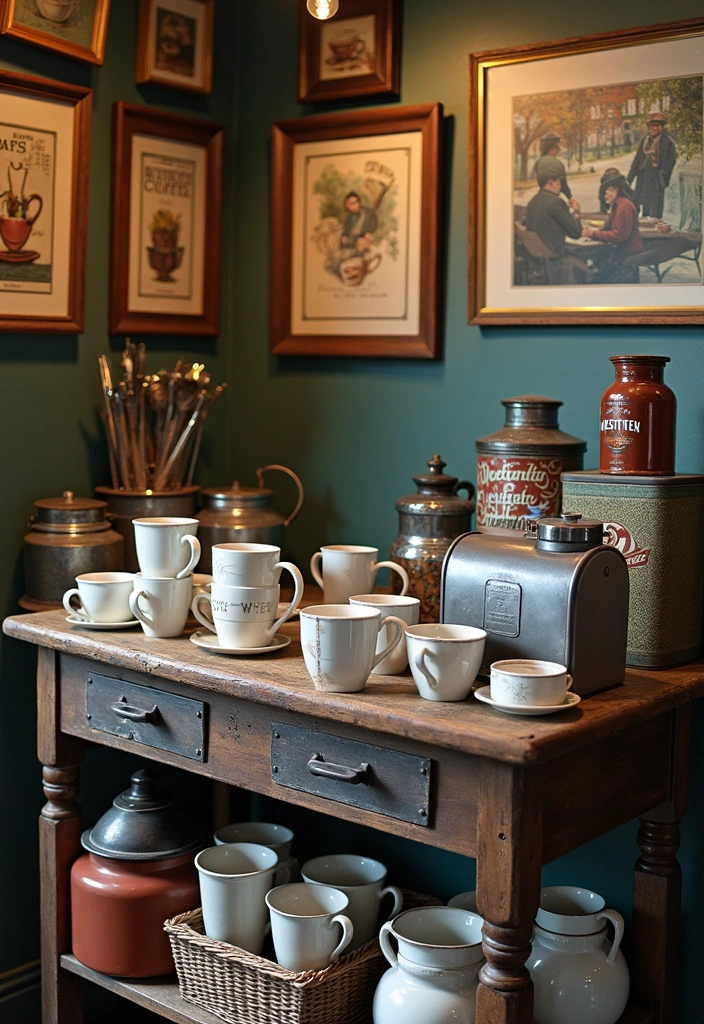 Pair this with a collection of mismatched mugs that not only showcase your unique style but also add a playful touch to your coffee routine. Enhance the nostalgic vibe further by displaying antique coffee tins and framed coffee-related art, which will beautifully reflect your love for coffee while inviting warmth into your home.