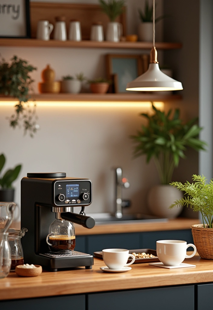 To complete your mini coffee bar, a compact coffee maker will ensure that your favorite brews are just a button away. Elevate your space with a beautiful decorative shelf to make your coffee station both functional and stylish, perfect for even the smallest kitchens!