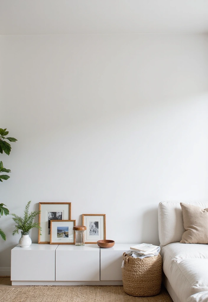 Additionally, a single flower arrangement can bring a refreshing touch of nature indoors, while stylish wall hangings can enhance your walls with subtle charm. Embrace these elements to personalize your space in a minimalist way.