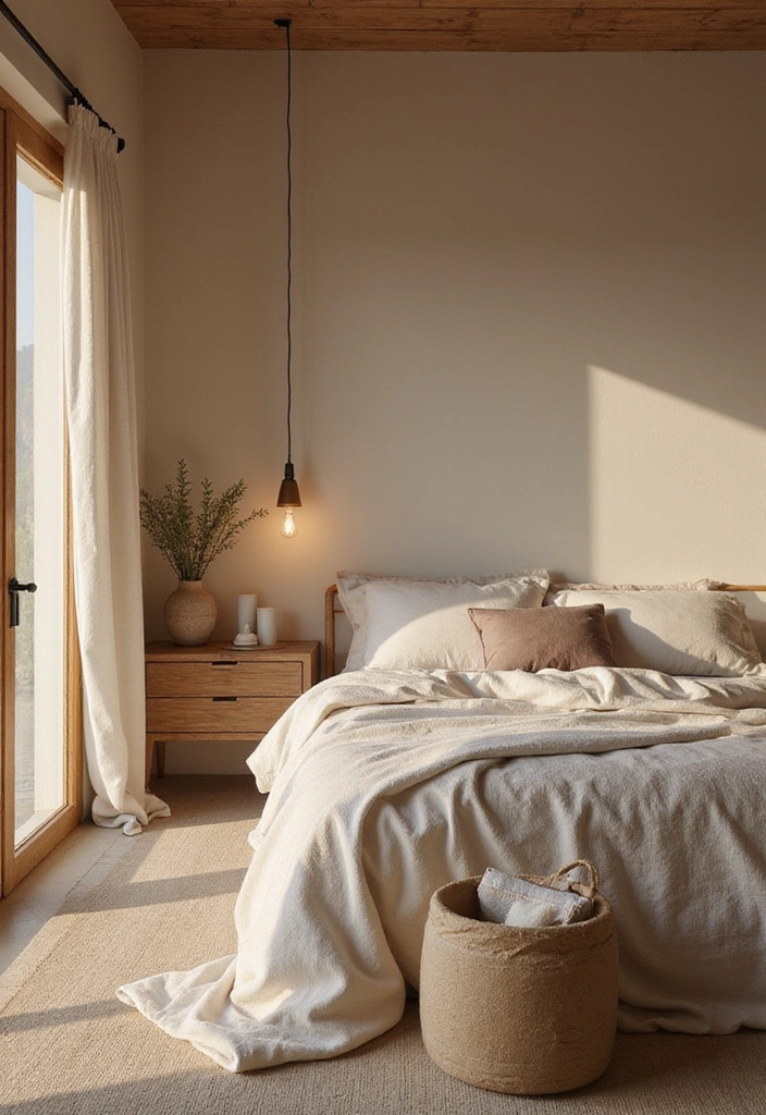 Additionally, opt for natural wood furniture and warm lighting fixtures to create a serene environment that feels both inviting and tranquil.
