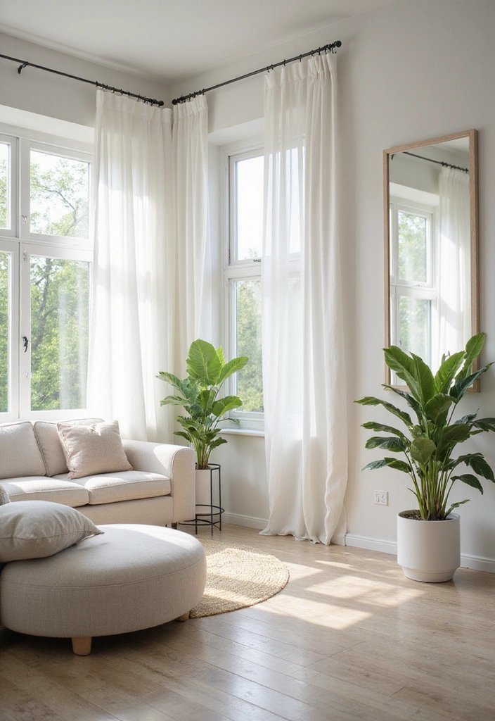To achieve this, consider using sheer curtains or opting for no window coverings at all, allowing sunlight to flood in and enhance your minimalist aesthetic.