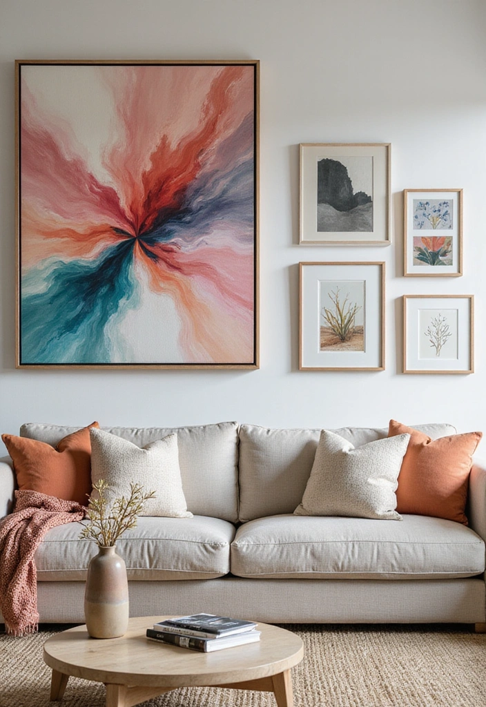 Choose artwork that contrasts with your neutral palette, whether through color, size, or texture. A large canvas or a gallery wall filled with smaller pieces can create visual interest without overwhelming the space.