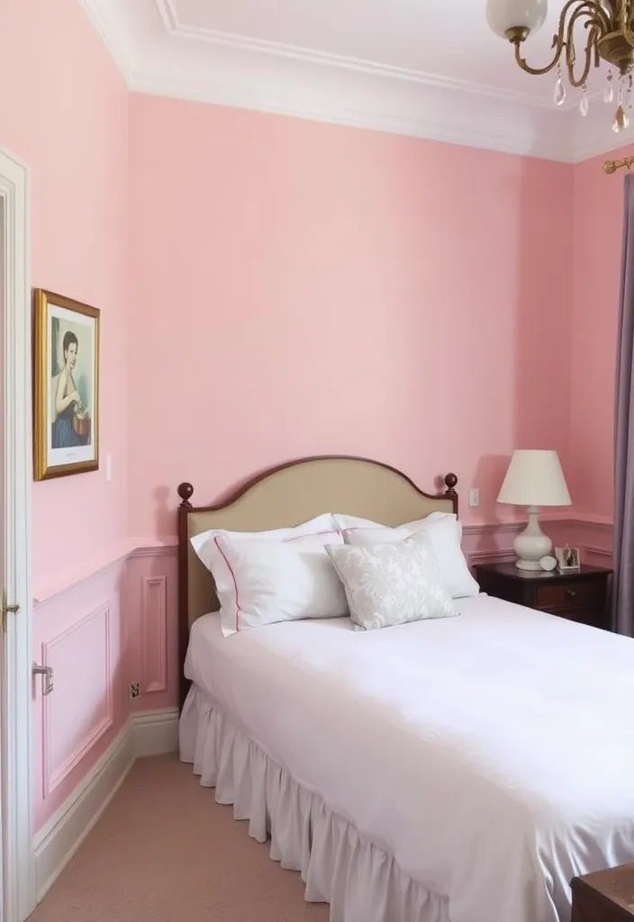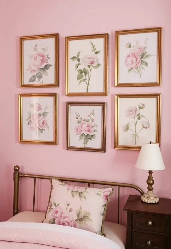 Adorn your walls with vintage artwork that complements your pink decor and enhances the room’s elegance.