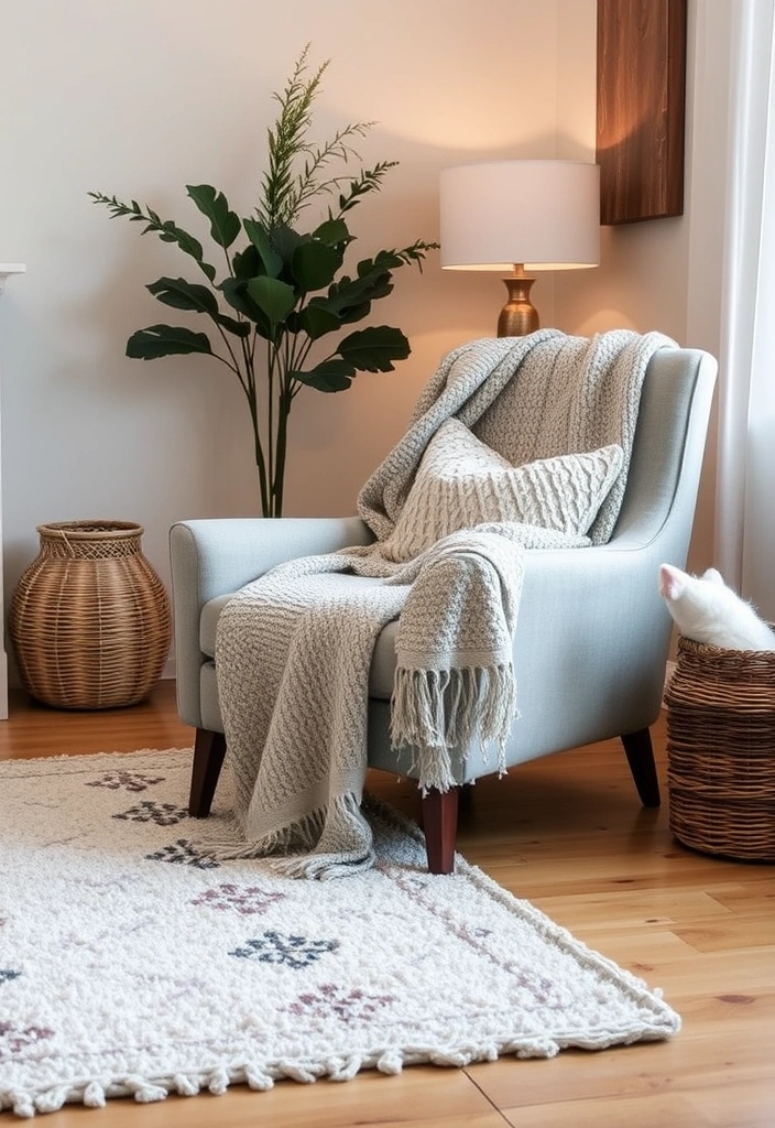 Consider adding a textured throw blanket for a touch of warmth and comfort, draping it over a cozy armchair.
