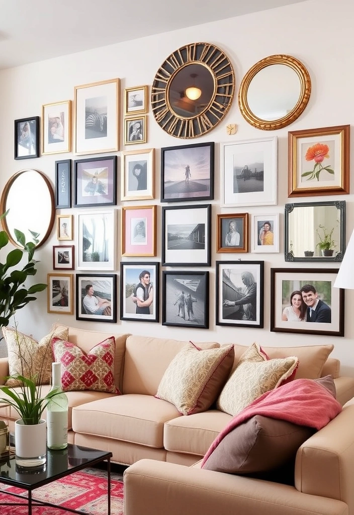Mix framed photos, artwork, and mirrors to create a visually appealing arrangement.
