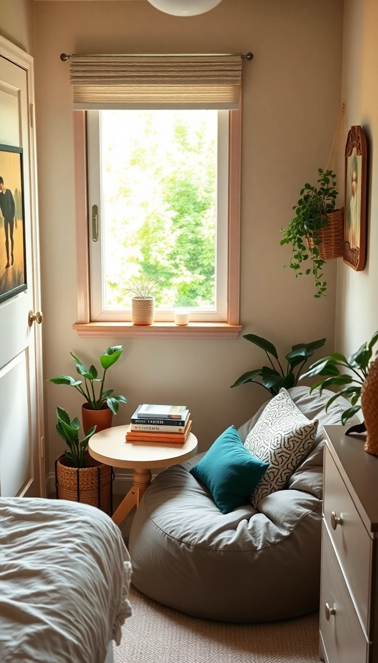 Position it near a window for natural light, and surround it with a few plants or cozy pillows to enhance the vibe. This special corner will provide a peaceful escape within your small space.