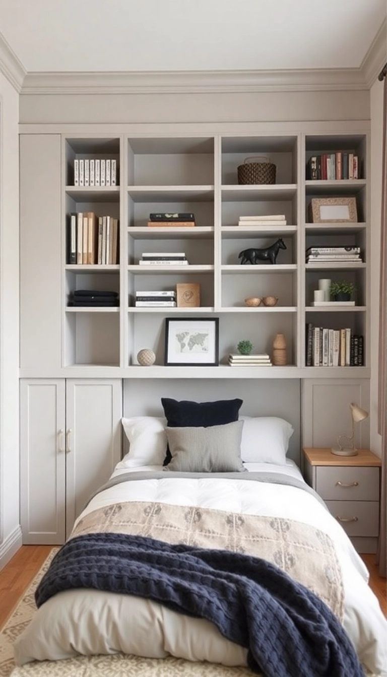 Built-in storage solutions can maximize space in your small bedroom while maintaining a clean aesthetic.