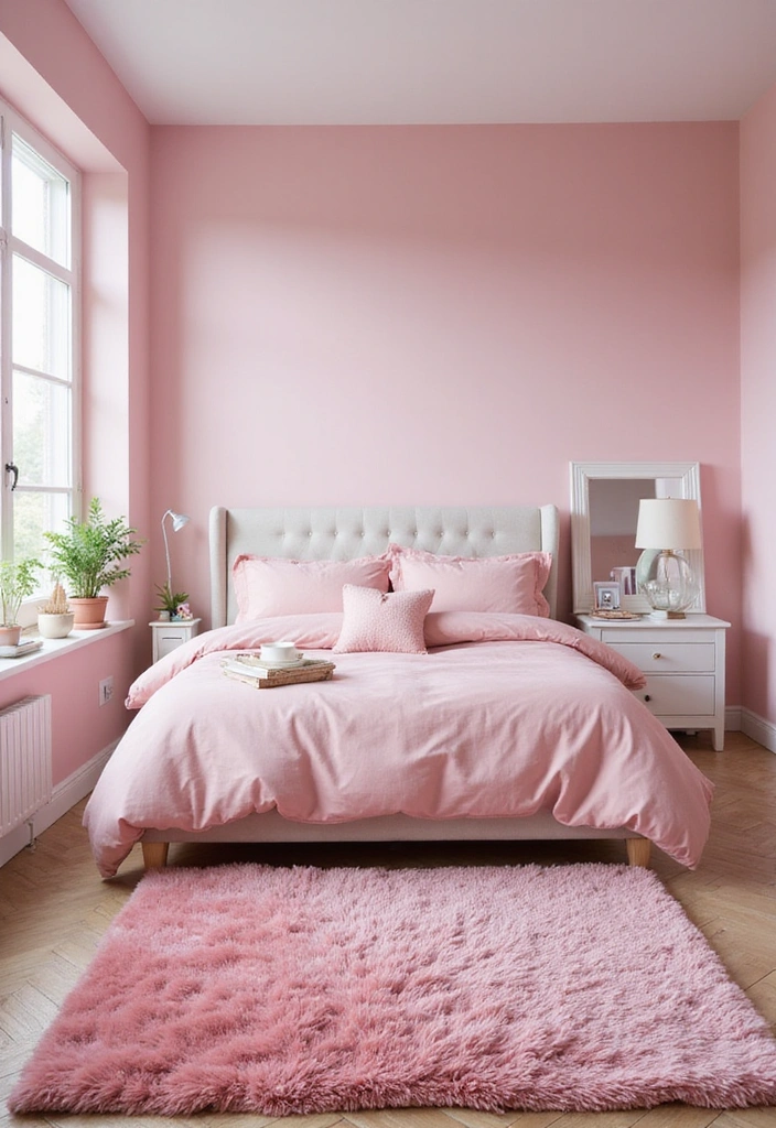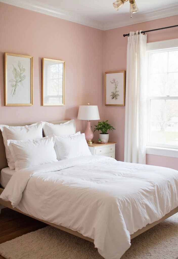 Start your pink bedroom journey with soft blush walls contrasted beautifully by crisp white trim.