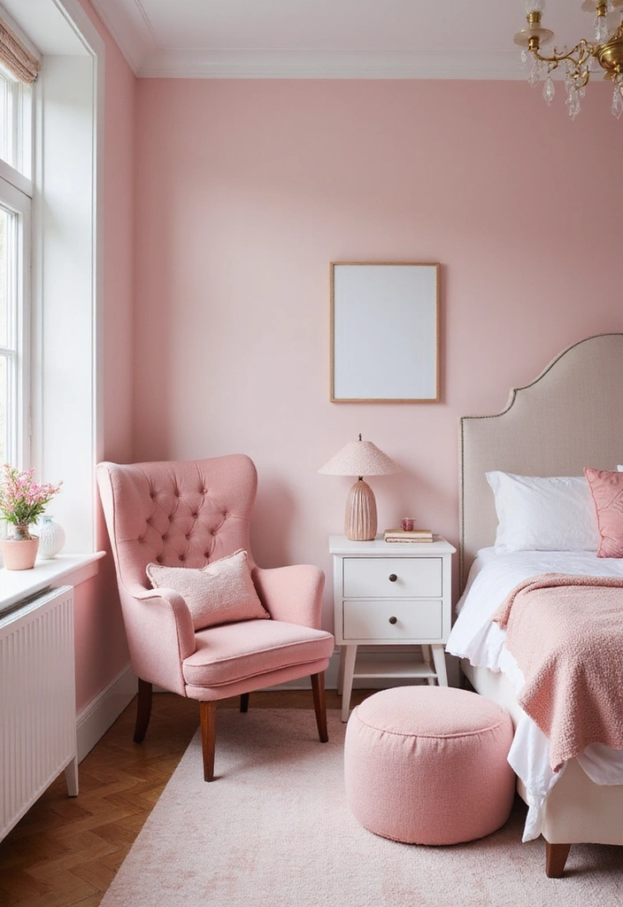 Consider adding a pink upholstered chair or a stylish pink ottoman to create comfortable seating.