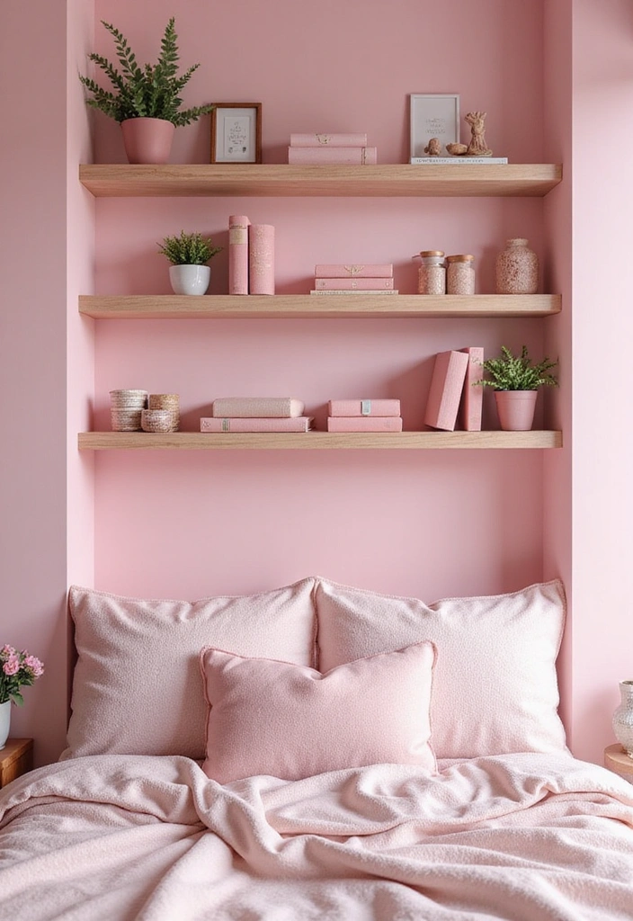 Utilizing shelves for decor can add both style and function to a small pink bedroom.