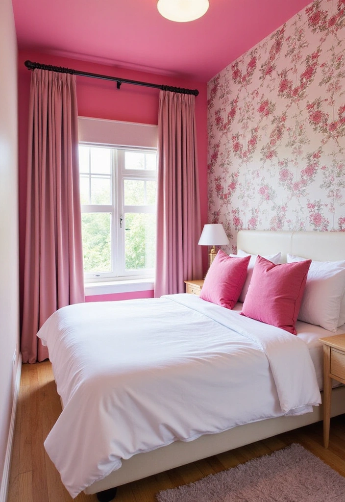 Transform a small bedroom with a striking pink accent wall using playful wallpaper.
