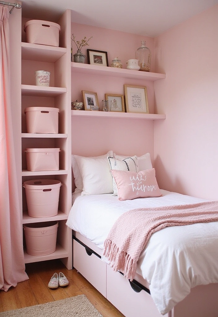 In small pink bedrooms, maximizing space is essential, and stylish storage solutions can help achieve that.