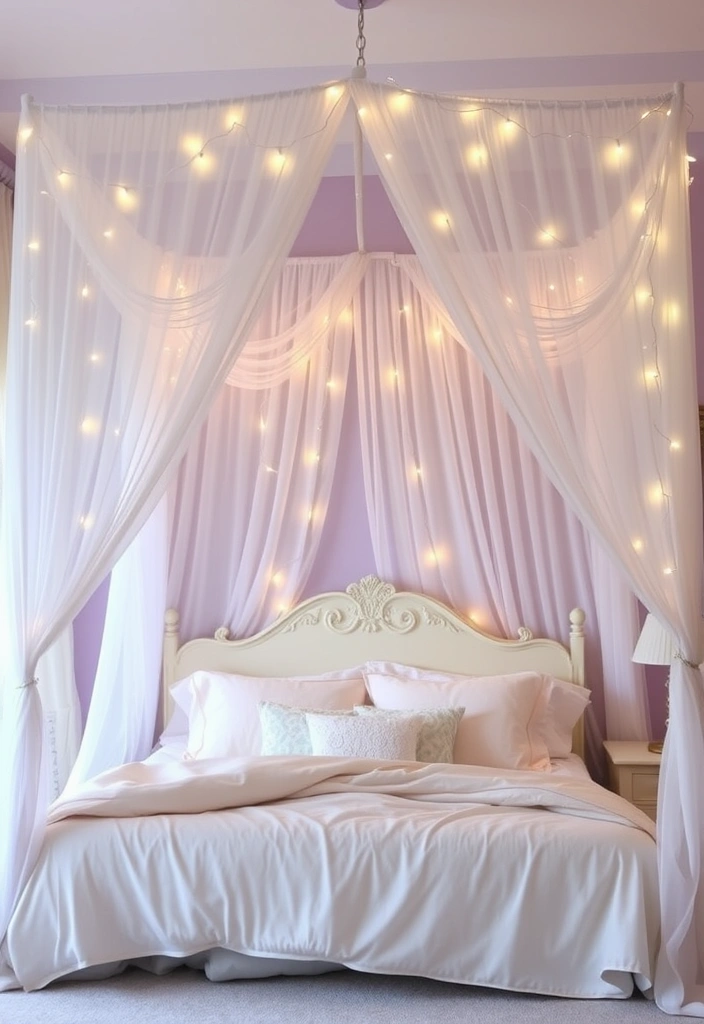 Create an enchanting atmosphere with delicate fairy lights that add a magical glow to your vintage princess bedroom.