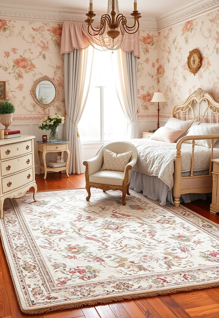 Anchor your vintage princess bedroom with a luxurious vintage-inspired rug that adds warmth and character to the space.